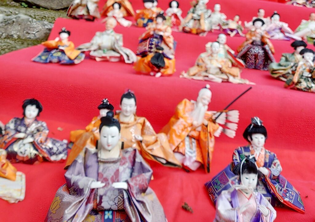 2月14・15・21・22・23・28日、3月1・3・7・8日は、秋月城跡の長屋門前の石段に約600体の雛人形が飾られます。この600体の雛人形は朝に並べて、夕方に片付ける大変な作業をしているんです。屋外雛展示の日は9:30に行けば、雛人形を並べる体験もできますよ。